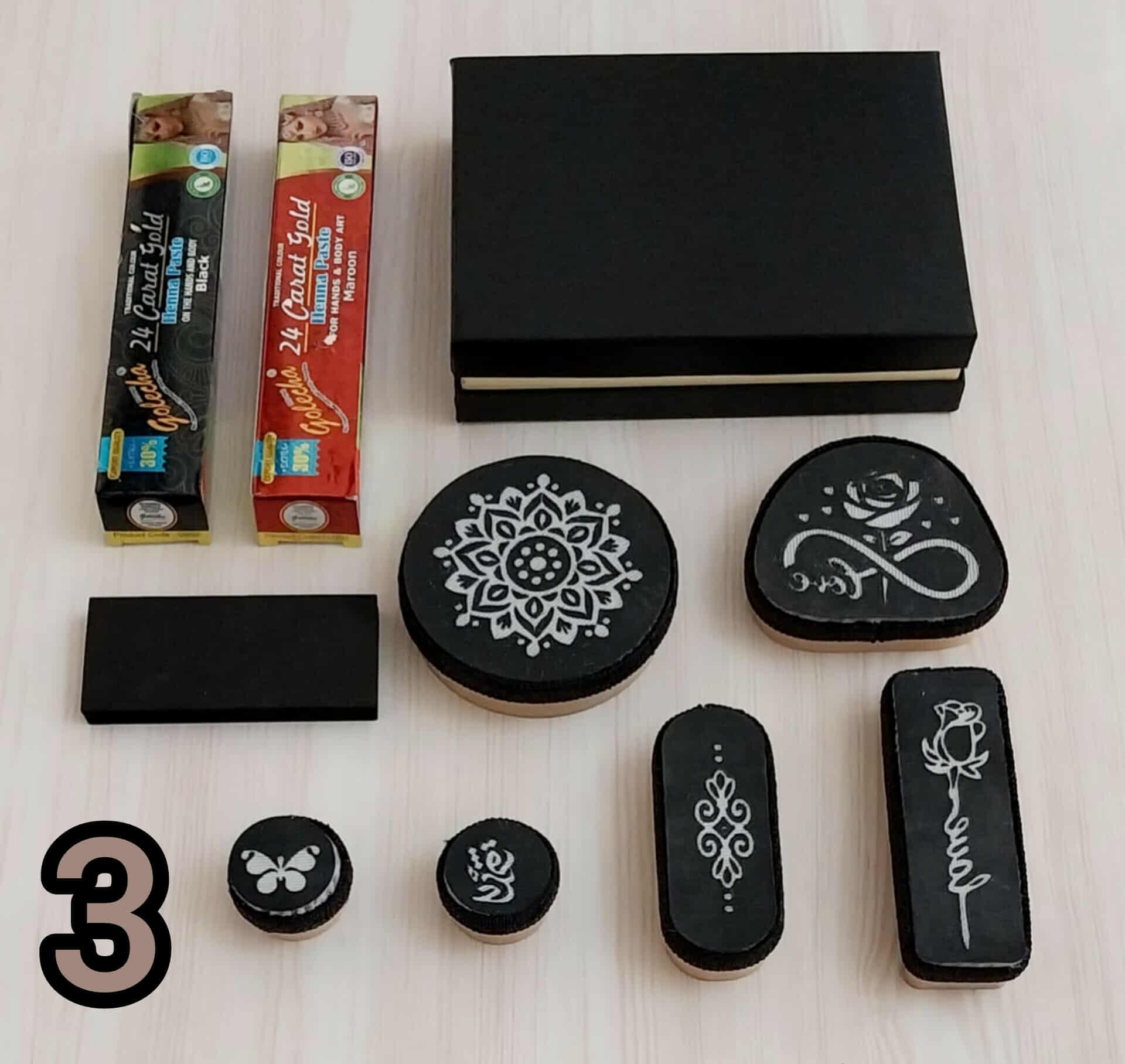 مجموعة من القوالب الخشبية مع خامة السيلكون الدائمة الاستخدام خاصة لطباعة جميع انواع الحنة وبكل اصنافها والوانها مصممة بشكل انيق ومميز من الصلابة والمرونة في الاداء بنفس الوقت مناسبة لصالونات التجميل والاستخدام المتكرر